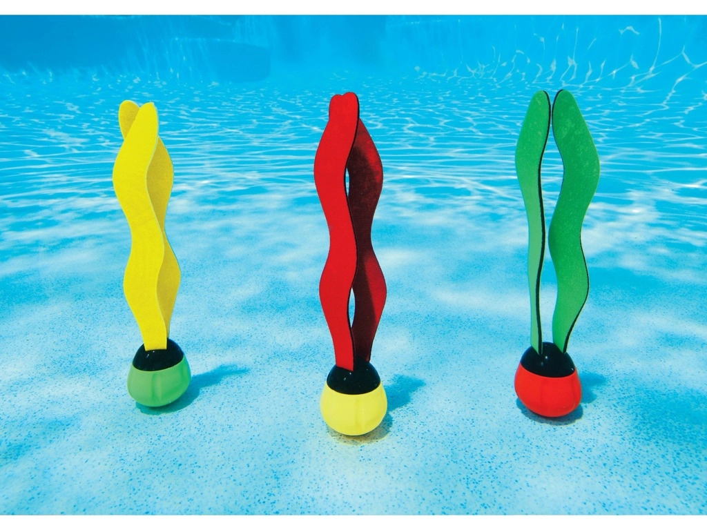 Το σετ περιλαμβάνει 3 τεμάχια σε διαφορετικούς χρωματικούς συνδυασμούς (κίτρινο, κόκκινο, πράσινο) για καλύτερο προσανατολισμό κάτω από το νερό. Το μαλακό πλαστικό είναι ευχάριστο στην αφή και ανθεκτικό, ενώ οι υφασμάτινες κορδέλες αυξάνουν την ορατότητα και την ελκυστικότητα στο παιχνίδι μέσα στην πισίνα.