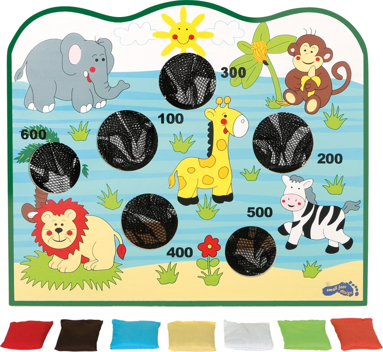Το ταμπλό με πολύχρωμες εικονογραφήσεις ζώων και οι πολύχρωμες σακουλίτσες κάνουν το παιχνίδι ελκυστικό και διασκεδαστικό για τα παιδιά.