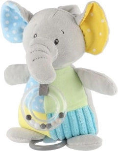 Ο ιδανικός σύντροφος παιχνιδιού για την κούνια ή το καρότσι χάρη στο ασφαλές κλιπ που επιτρέπει εύκολη ανάρτηση. Η υφή με ανάγλυφο του ελέφαντα ενθαρρύνει τη σωματοαισθητική εξερεύνηση, ενώ ο πολύχρωμος σχεδιασμός του τραβά το βλέμμα του παιδιού.