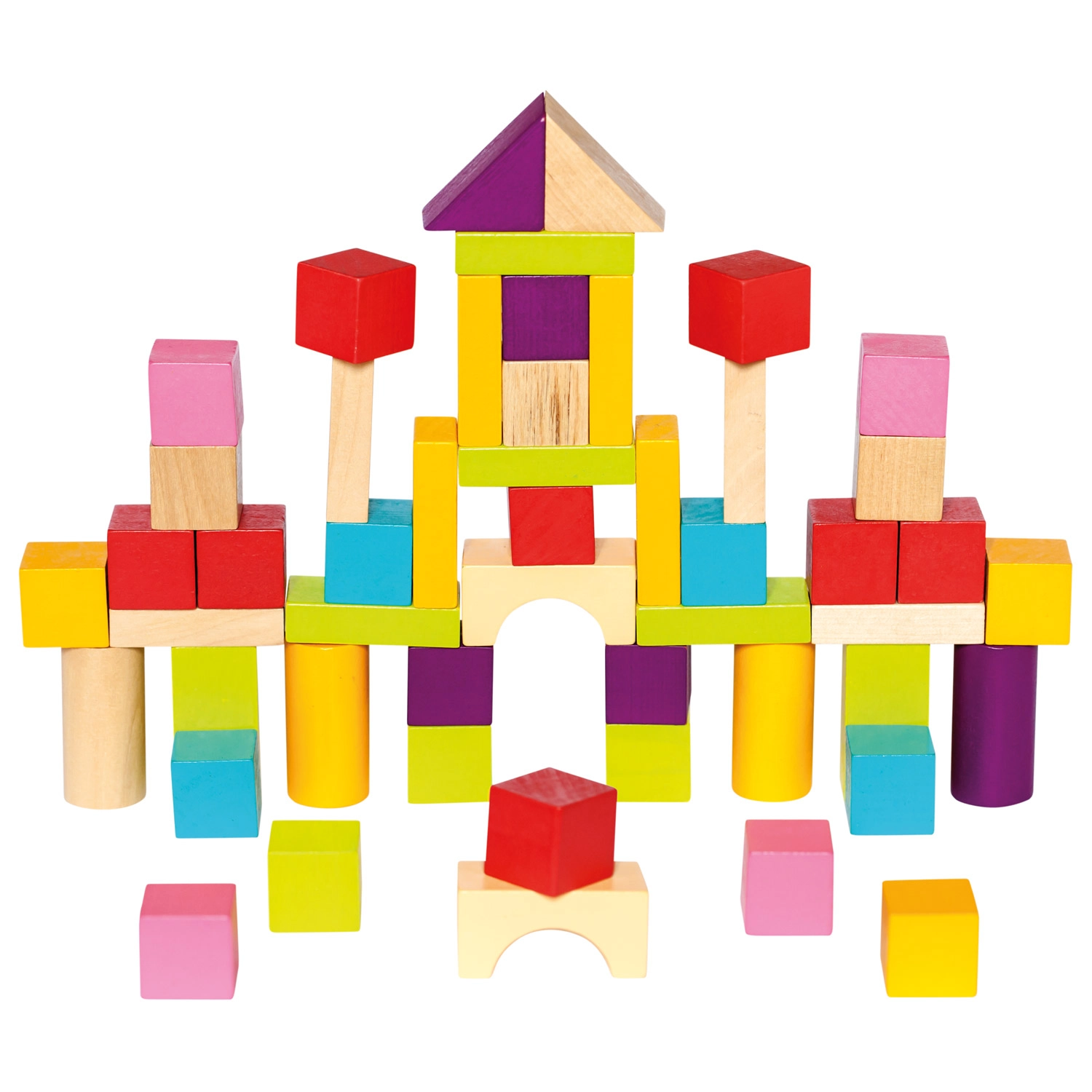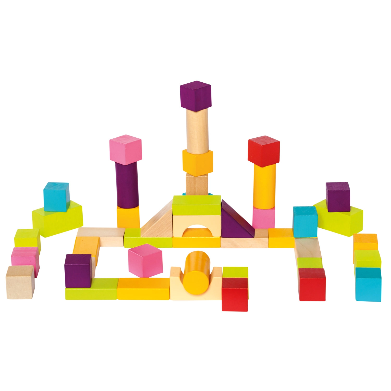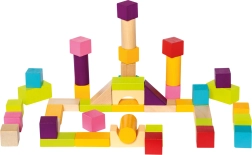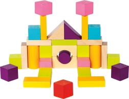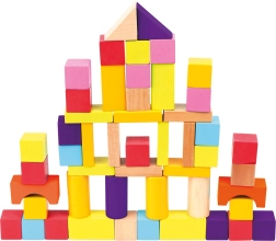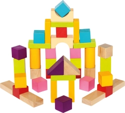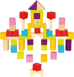 Χάρη στα ποικίλα σχήματα — κύβοι, κύλινδροι, καμάρες και τρίγωνα — τα παιδιά χτίζουν πύργους, σπιτάκια και φανταστικές κατασκευές. Το λείο, ποιοτικά κατεργασμένο ξύλο και τα έντονα χρώματα υποστηρίζουν τον αισθητηριακό ανάπτυξη και το δημιουργικό παιχνίδι.