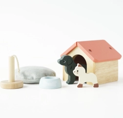 Εμπλουτίστε τον παιδικό κόσμο φαντασίας με ένα χαριτωμένο σετ ξύλινων κατοικιδίων – σκυλάκι και γατούλα με σπιτάκι και αξεσουάρ. Αυτό το ποιοτικό αξεσουάρ για κουκλόσπιτα και σκηνές παιχνιδιού ενισχύει το κοινωνικό παιχνίδι, την επικοινωνία και τη φαντασία. Κατασκευασμένο από ξύλο FSC, χειροποίητα ζωγραφισμένο με μη τοξικά, υδατοδιαλυτά χρώματα και σχεδιασμένο για μεγάλη αντοχή.