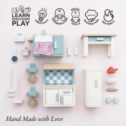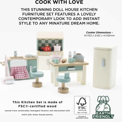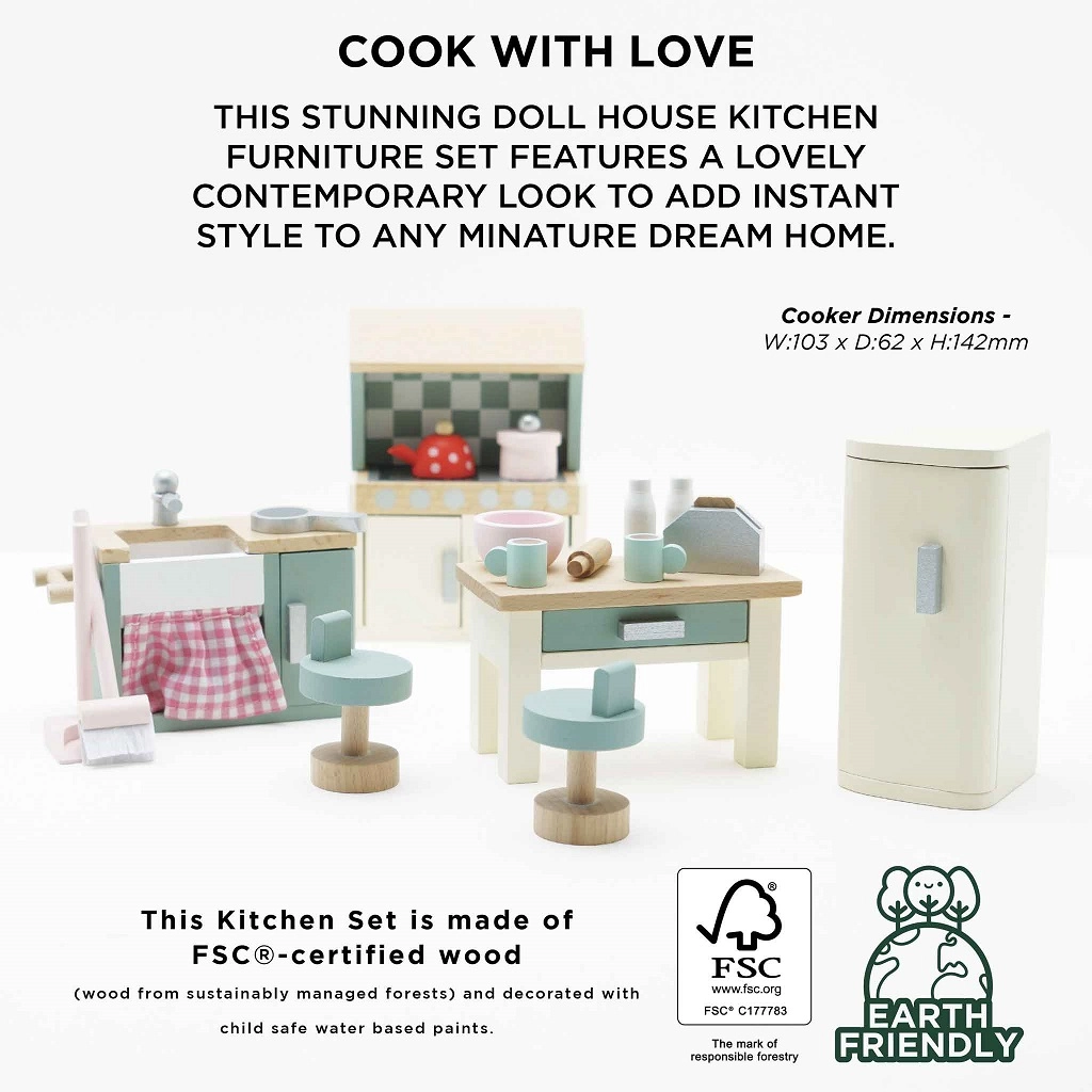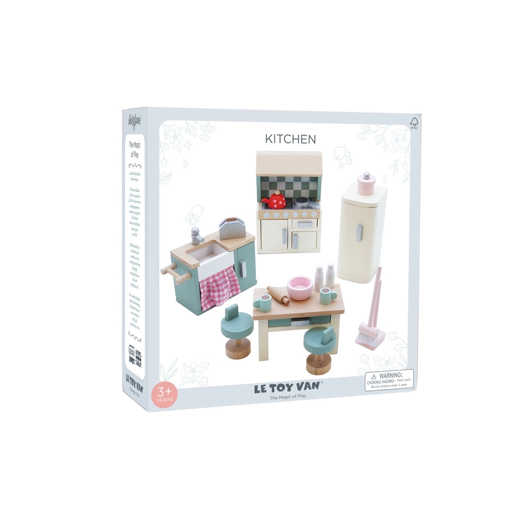 Η τέλεια κουζίνα για κουκλόσπιτο από τη Le Toy Van. Αυτό το υπέροχο ξύλινο σετ περιλαμβάνει ό,τι χρειάζεστε για μινιατούρες γαστρονομικές περιπέτειες - νεροχύτη, εστία, φούρνο, ψυγείο και τραπέζι με καρέκλες. Όλα κατασκευασμένα στο χέρι από βιώσιμα υλικά.