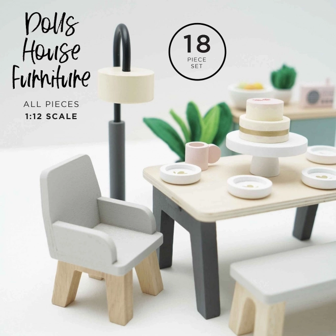 Αυτό το γοητευτικό σετ τραπεζαρίας είναι κατασκευασμένο από ποιοτικό ξύλο πιστοποιημένο από το FSC και φέρνει σε κάθε κουκλόσπιτο μια πινελιά κομψότητας. Περιλαμβάνει 18 στοιχεία, μεταξύ των οποίων τραπέζι, δύο πολυθρόνες, παγκάκι, λάμπα, μπουφέ και διακοσμητικά αξεσουάρ όπως φυτά, φρουτιέρα και τούρτα. Αυτό το σετ όχι μόνο δείχνει υπέροχο, αλλά επίσης υποστηρίζει τις γνωστικές και επικοινωνιακές δεξιότητες των παιδιών. Είναι διακοσμημένο με μη τοξικά χρώματα με βάση το νερό και είναι συμβατό με άλλα κουκλόσπιτα Le Toy Van Dolls.