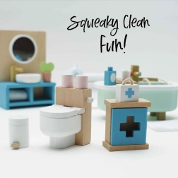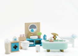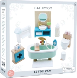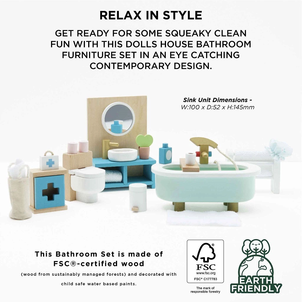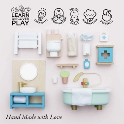 Στιλάτο σετ επίπλων μπάνιου για κουκλόσπιτο σε κλίμακα 1:12 από τη μάρκα LE TOY VAN. Περιλαμβάνει μπανιέρα, τουαλέτα, νιπτήρα, κρεμάστρα για πετσέτες και φαρμακείο, χειροποίητα βαμμένα με μη τοξικά, υδατοδιαλυτά χρώματα. Κατασκευασμένο ηθικά από βιώσιμα υλικά, ενισχύει το δημιουργικό παιχνίδι, τις επικοινωνιακές δεξιότητες και τον συντονισμό.