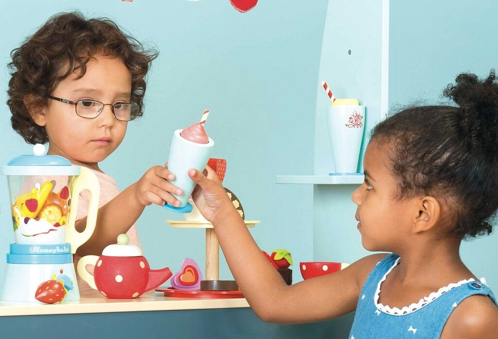 Αυτό το κομψό ξύλινο σετ από τη συλλογή Honeybake μετατρέπει κάθε παιδική κουζίνα σε μπαρ σμούθι. Τα παιδιά μπορούν με ασφάλεια να “κόβουν” τα φρούτα με βέλκρο, να γεμίζουν το δοχείο του μίξερ και να σερβίρουν νόστιμα ροφήματα σε δύο κύπελλα με καλαμάκι. Οι ρεαλιστικές λεπτομέρειες υποστηρίζουν παιχνίδια ρόλων, ανάπτυξη λεπτής κινητικότητας και γνωστικών δεξιοτήτων.