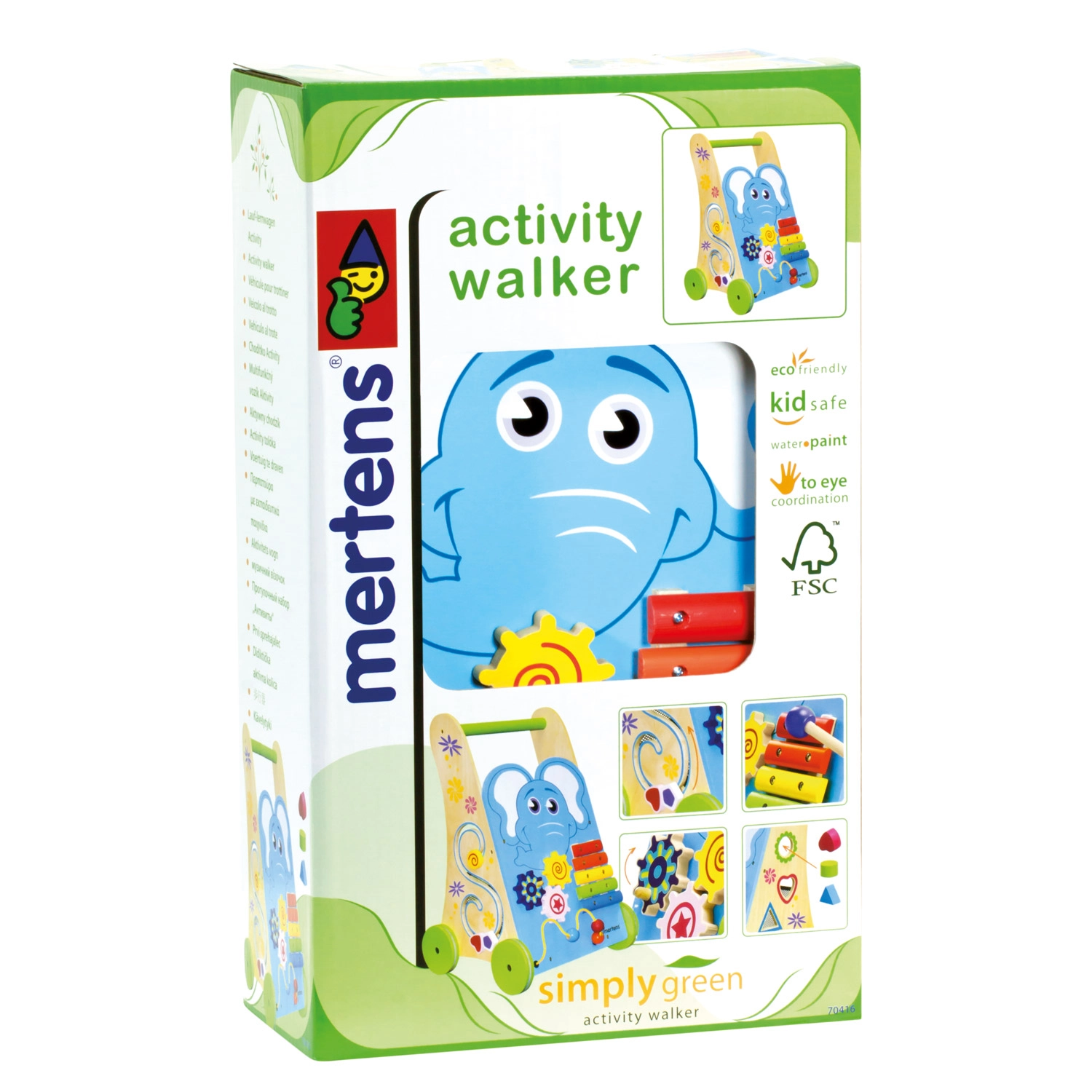 Οι τροχοί με λαστιχένια πέλματα κυλούν αθόρυβα και προστατεύουν τα δάπεδα. Η περπατούρα είναι φτιαγμένη από ποιοτική κόντρα πλακέ και μασίφ ξύλο από πιστοποιημένο ξύλο FSC, πληρώντας αυστηρά οικολογικά και κοινωνικά πρότυπα. Μελετημένη εργονομία για σταθερότητα, κατάλληλη για παιδιά από 18 μηνών.