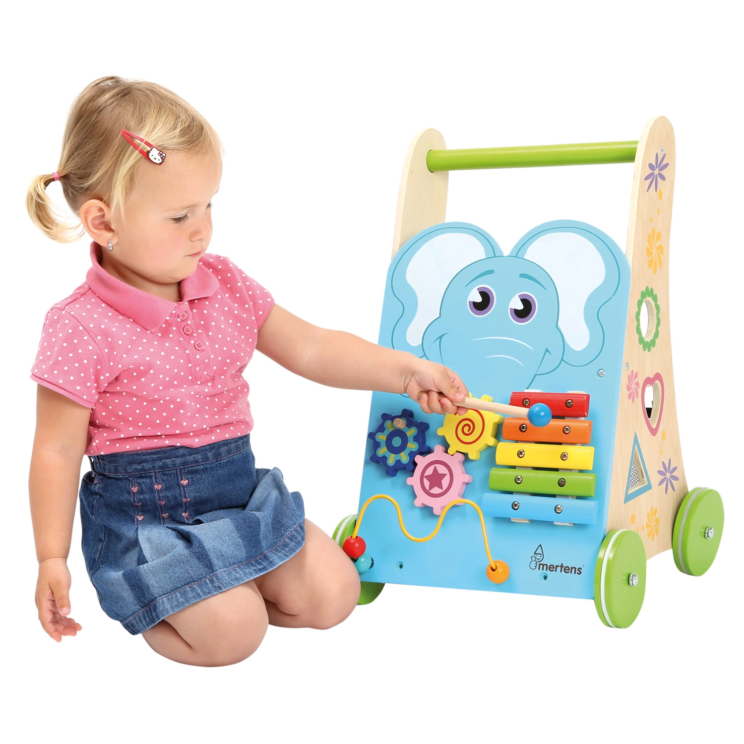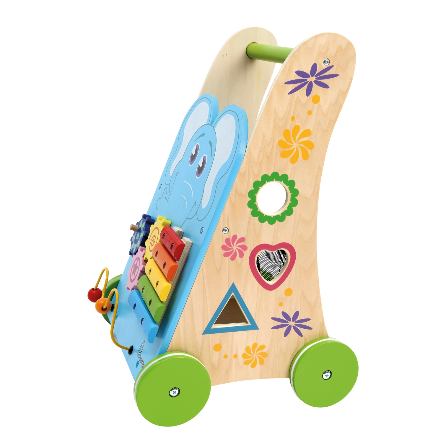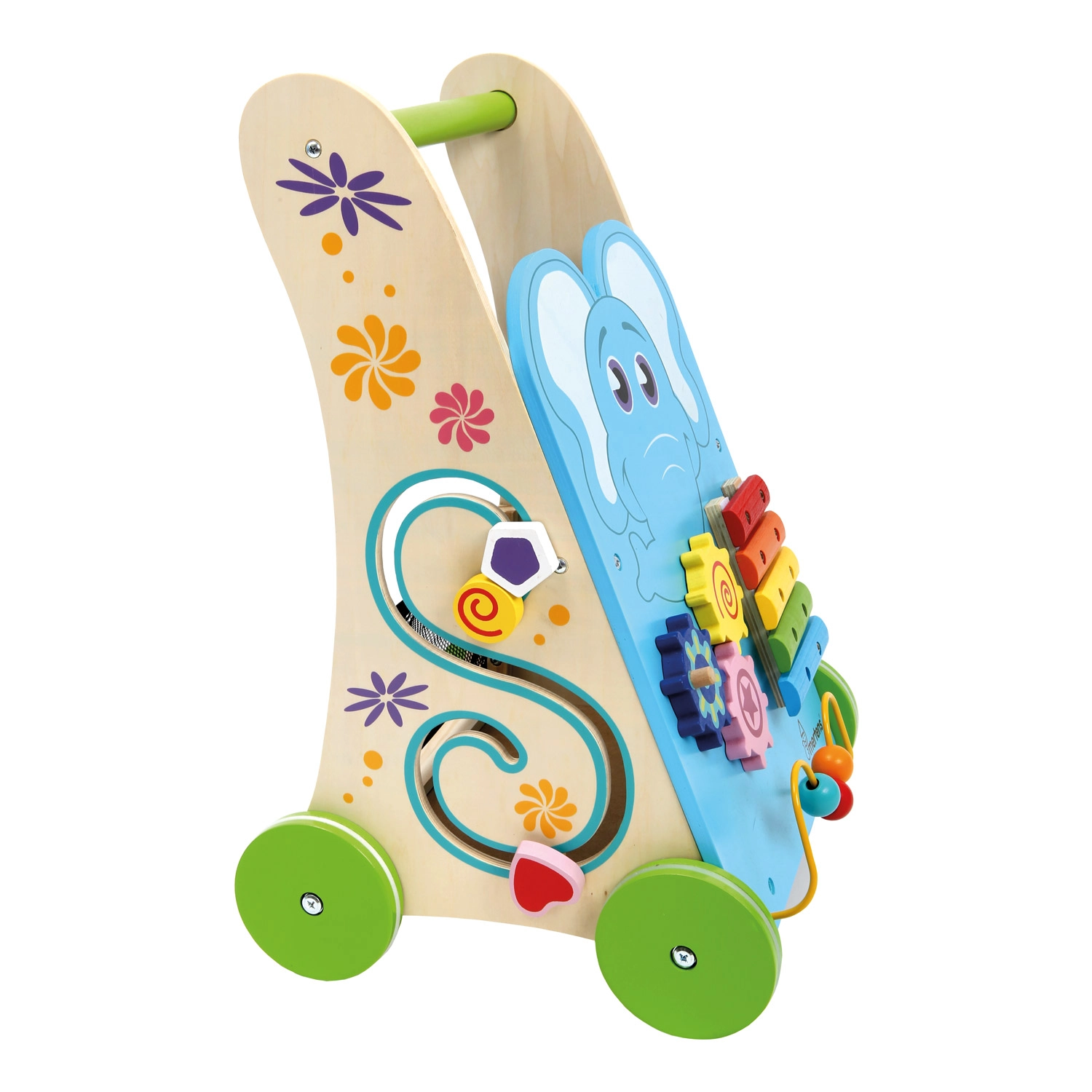 Το ξυλόφωνο με μπαγκέτα, οι οδοντωτοί τροχοί, ο λαβύρινθος με χάντρες και το παιχνίδι ταξινόμησης σχημάτων αναπτύσσουν λεπτή κινητικότητα, ακουστική αντίληψη και λογική σε μία συμπαγή περπατούρα.