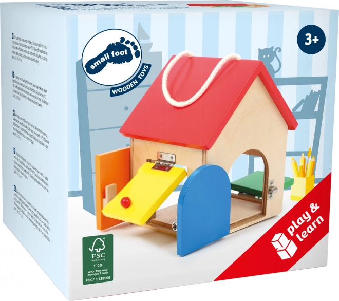 Αυτό το ποιοτικό ξύλινο σπιτάκι από τη small foot είναι γεμάτο διαδραστικά στοιχεία – κάθε πορτάκι έχει διαφορετικό τύπο κλεισίματος, ώστε τα παιδιά με διασκεδαστικό τρόπο να εξασκούν την επιδεξιότητα των δαχτύλων, τη λογική σκέψη και την υπομονή. Χάρη στη στιβαρή κατασκευή και τα έντονα χρώματα, είναι ιδανικό για παιχνίδι στο σπίτι και σε ταξίδια.