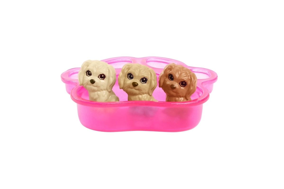 Καλώς ήρθατε στον υπέροχο κόσμο της Barbie και στην άφιξη των νέων κουταβιών! Αυτό το σετ επιτρέπει στα παιδιά να βοηθήσουν τη Barbie και τη σκυλίτσα της να υποδεχτούν τρία χαριτωμένα κουταβάκια. Αρκεί να πατήσετε στην πλάτη της μαμάς-σκύλου και, ένα-ένα, θα εμφανιστούν τα μικρά κουταβάκια. Μετά τη «γέννηση», μπορείτε να γεμίσετε τη λεκάνη με κρύο νερό και να χρησιμοποιήσετε την πετσέτα για να αποκαλύψετε μια ειδική λεπτομέρεια σε κάθε κουταβάκι.