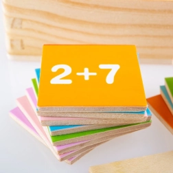 - Πολύχρωμα ξύλινα κομμάτια για πρόσθεση και αφαίρεση των αριθμών 1–9, αποθηκευμένα σε κουτί