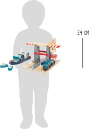 Αυτό το προσεγμένο λιμενικό σετ προσφέρει στα παιδιά ρεαλιστικό παιχνίδι logistics: το πλοίο με δύο ρυμουλκά είναι έτοιμο να αποπλεύσει, ενώ ο γερανός μεταφορτώνει πολύχρωμα κοντέινερ χάρη στους ενσωματωμένους μαγνήτες. Ανθεκτικά ξύλινα κομμάτια και ομαλά λειτουργικά στοιχεία ενισχύουν τη λεπτή κινητικότητα, τη φαντασία και την υπομονή.