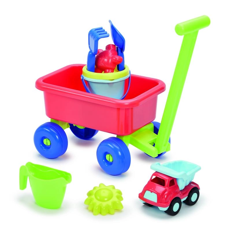 Ελαφρύ αλλά σταθερό καρότσι με μακριά λαβή και φαρδιά ρόδες επιτρέπει στα παιδιά να μεταφέρουν άνετα εργαλεία και άμμο μεταξύ του «παιδότοπου» και του «εργοταξίου». Ιδανικός βοηθός για αποθήκευση και μεταφορά όλου του σετ.