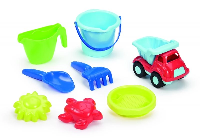 Το σετ περιλαμβάνει κουβαδάκι διαμέτρου 10 cm, σουρωτήρι, τσουγκράνα, φτυαράκι, δύο καλούπια και φορτηγάκι – ανατρεπόμενο για ακόμα πιο διασκεδαστικό παιχνίδι. Οι διαστάσεις του καροτσιού 69,5 × 20 × 20,5 cm (περιλαμβάνει τη λαβή) διευκολύνουν τον χειρισμό ακόμη και από παιδιά. Μετά το παιχνίδι, απλώς ξεπλύνετε με νερό και είναι έτοιμο για νέες περιπέτειες.