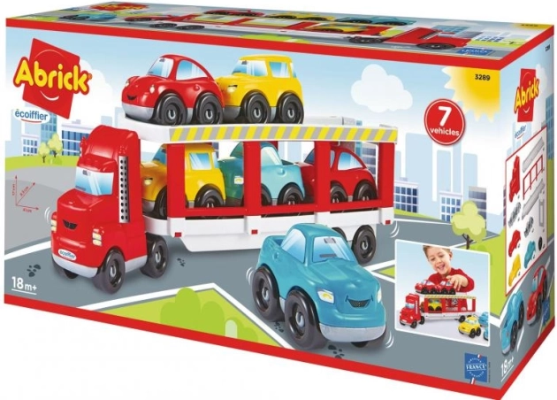 Ελκυστικός μεταφορέας Abrick για μεταφορά μικρών αυτοκινήτων! Ο μεταφορέας είναι εξοπλισμένος με αναδιπλούμενη ράμπα που επιτρέπει εύκολη φόρτωση και εκφόρτωση έξι χρωματιστών αυτοκινήτων.