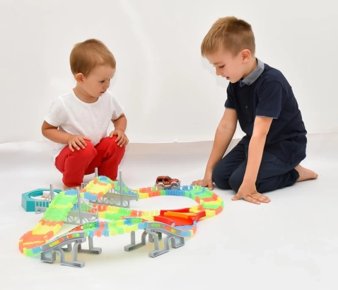 Στήστε τη δική σας αγωνιστική πίστα από 192 πολύχρωμα κομμάτια και απολαύστε τη διαδρομή με το αυτοκινητάκι LED, που «διαπερνά» κάθε στροφή με το φως του. Τα κομμάτια είναι ευέλικτα και κουμπώνουν εύκολα, ώστε τα παιδιά να αλλάζουν γρήγορα το σχήμα και το μήκος της διαδρομής και να πειραματίζονται με γέφυρες, στροφές και κατηφόρες.