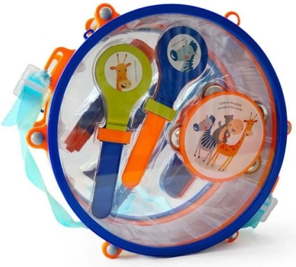 Αυτό το πολυχρηστικό παιδικό μουσικό σετ είναι ιδανικό για τα πρώτα βήματα στον κόσμο του ρυθμού και της μελωδίας. Χάρη στα ελαφριά και ασφαλή υλικά, τα παιδιά το χειρίζονται εύκολα και απολαμβάνουν ώρες δημιουργικής διασκέδασης. Το ταμπούρλο χρησιμεύει όχι μόνο για παιχνίδι, αλλά και ως φορητή βαλιτσούλα όπου χωρούν όλα τα όργανα.