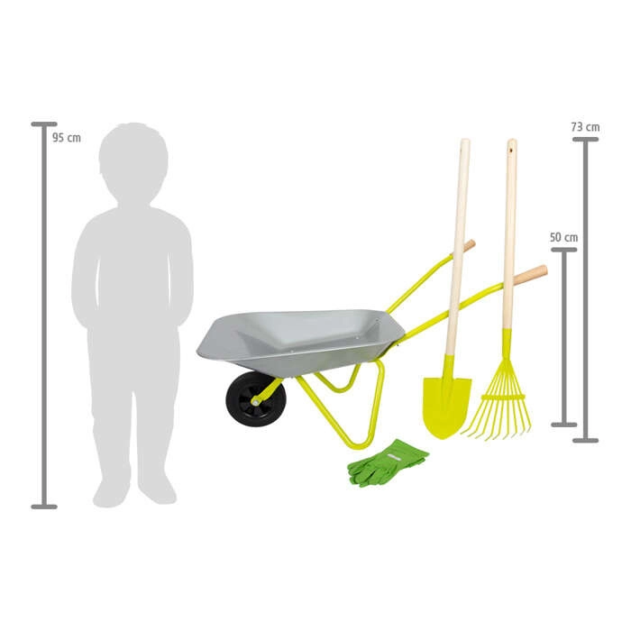 - Πρακτικές διαστάσεις: καροτσάκι περίπου 79 × 36 × 50 cm, ύψος λαβών 50 cm· μήκος φτυαριού και τσουγκράνας περίπου 73 cm.