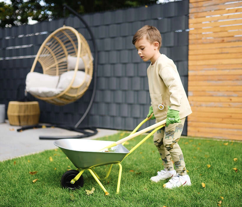 Η μεταλλική καρότσα, το στιβαρό πλαίσιο και ο σχεδιασμός με έναν τροχό διευκολύνουν τους ελιγμούς. Τα παιδιά μεταφέρουν εύκολα φύλλα, χώμα και μικρά εργαλεία χάρη στον όγκο περίπου 10 λίτρων και την αντοχή έως 15 kg.
