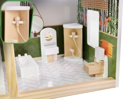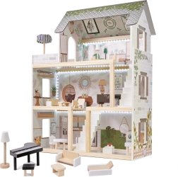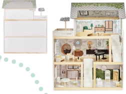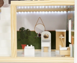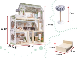 Η ασφάλεια είναι προτεραιότητα: όλες οι ακμές είναι λεία γυαλισμένες και ο συνδυασμός ποιοτικής πλάκας MDF, στιβαρών συνδέσεων και σταθερής κατασκευής εξασφαλίζει μεγάλη αντοχή. Η παλέτα παστέλ, γήινων τόνων ταιριάζει με τα μοντέρνα παιδικά δωμάτια και κάνει το κουκλόσπιτο εντυπωσιακό διακοσμητικό στοιχείο.