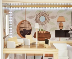 Περιλαμβάνονται πιάνο με σκαμπό, σετ σαλονιού, τραπεζάκια, λάμπα, τηλεόραση, σετ τραπεζαρίας, κρεβάτι, εξοπλισμός μπάνιου και αξεσουάρ βεράντας – όλα ταιριασμένα σε boho στυλ.