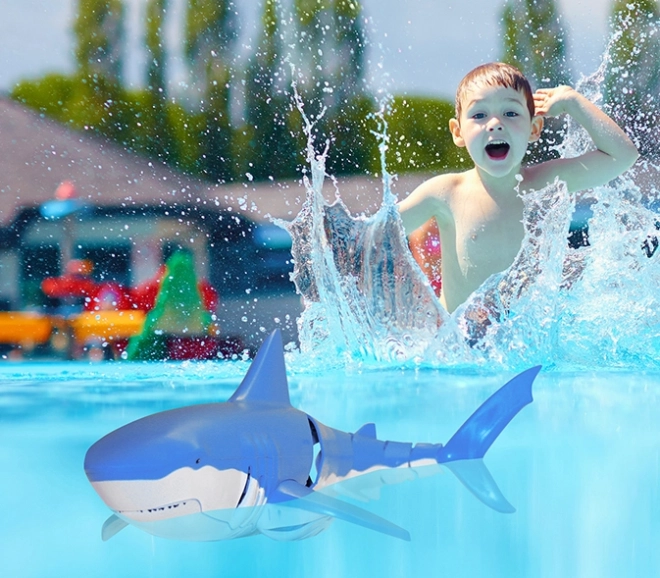 Με το μαύρο τηλεχειριστήριο με μπλε κουμπιά μπορείτε εύκολα να ελέγχετε τον καρχαρία και τις κινήσεις του.