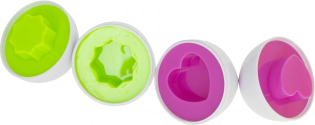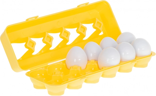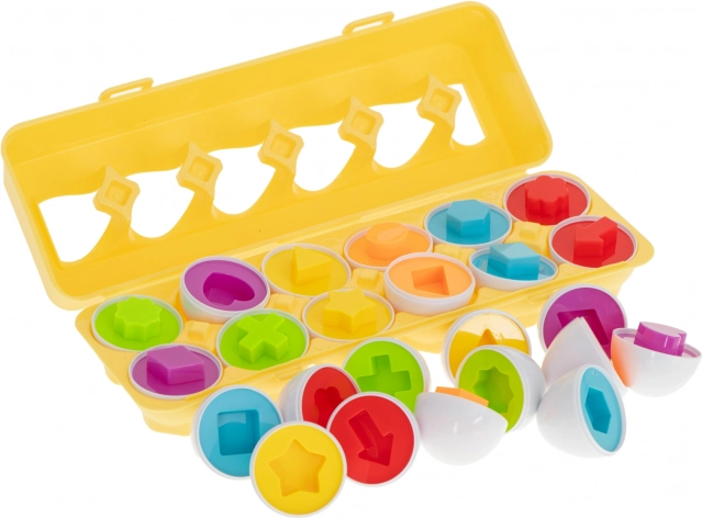 Το σετ περιλαμβάνει 12 αυγά με διαφορετικά σχήματα και χρώματα κρυμμένα κάτω από το κέλυφος. Το παιχνίδι συνίσταται στο ταίριασμα των μισών αυγών σύμφωνα με το σχήμα και το χρώμα ώστε να δημιουργηθεί ένα σύνολο. Πρόκειται όχι μόνο για μια διασκεδαστική αλλά και εκπαιδευτική δραστηριότητα που ενισχύει τη λογική σκέψη. Τα αυγά είναι ελαφριά και εύκολα στη μεταφορά, κάτι που τα καθιστά ιδανικά για απασχόληση σε μακρινά ταξίδια ή κατά την αναμονή για επίσκεψη σε γιατρό.
