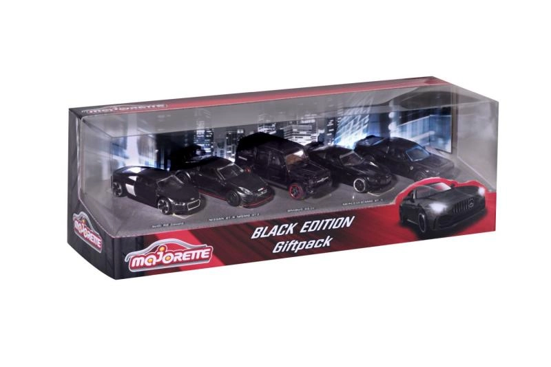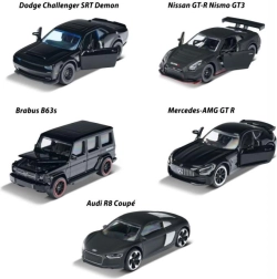 Ανακαλύψτε το συλλεκτικό σετ Majorette Black Edition με πέντε μεταλλικά μοντέλα αυτοκινήτων σε κλίμακα 1:64. Η συλλογή σε κομψό μαύρο φινίρισμα περιλαμβάνει εμβληματικά οχήματα όπως AUDI R8, BRABUS B63, NISSAN GT3 NISMO GTR, DODGE DEMON και Mercedes-AMG GTR. Ορισμένα μοντέλα διαθέτουν ανοιγόμενα μέρη και όλα ξεχωρίζουν για την λεπτομερή κατασκευή και τους ελεύθερα κυλιόμενους τροχούς – ιδανικά τόσο για παιχνίδι όσο και για έκθεση.