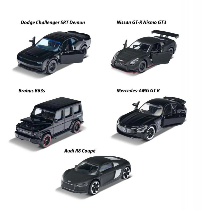 Στο σετ θα βρείτε τα AUDI R8, BRABUS B63, NISSAN GT3 NISMO GTR, DODGE DEMON και Mercedes-AMG GTR – μια επιλογή που θα ενθουσιάσει κάθε φίλο των αυτοκινήτων.