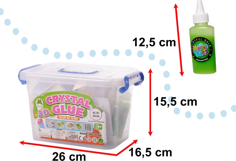 Μπορείτε επίσης να ρίχνετε το τζελ απευθείας στο διάλυμα και να δημιουργείτε δικά σας μοναδικά σχήματα. Η δημιουργία αναπτύσσει δημιουργικότητα, υπομονή και λεπτή κινητικότητα και αποτελεί εξαιρετική χαλάρωση και για ενήλικες. Ολόκληρο το σετ φυλάσσεται σε ανθεκτικό πλαστικό κουτί για εύκολη μεταφορά και αποθήκευση.