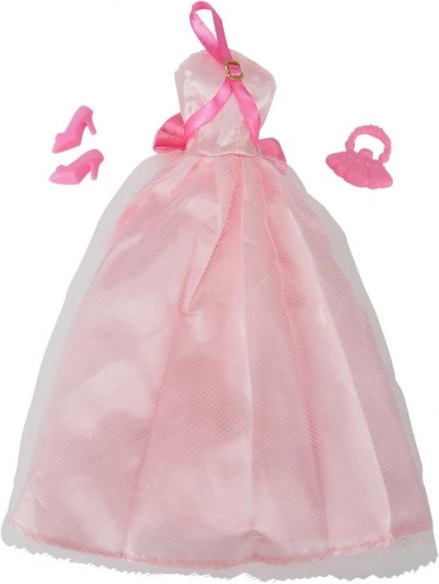 Στο σετ περιλαμβάνονται ταιριαστά ψηλοτάκουνα παπούτσια και τσάντα, που ολοκληρώνουν την κομψή συλλογή για κούκλες.