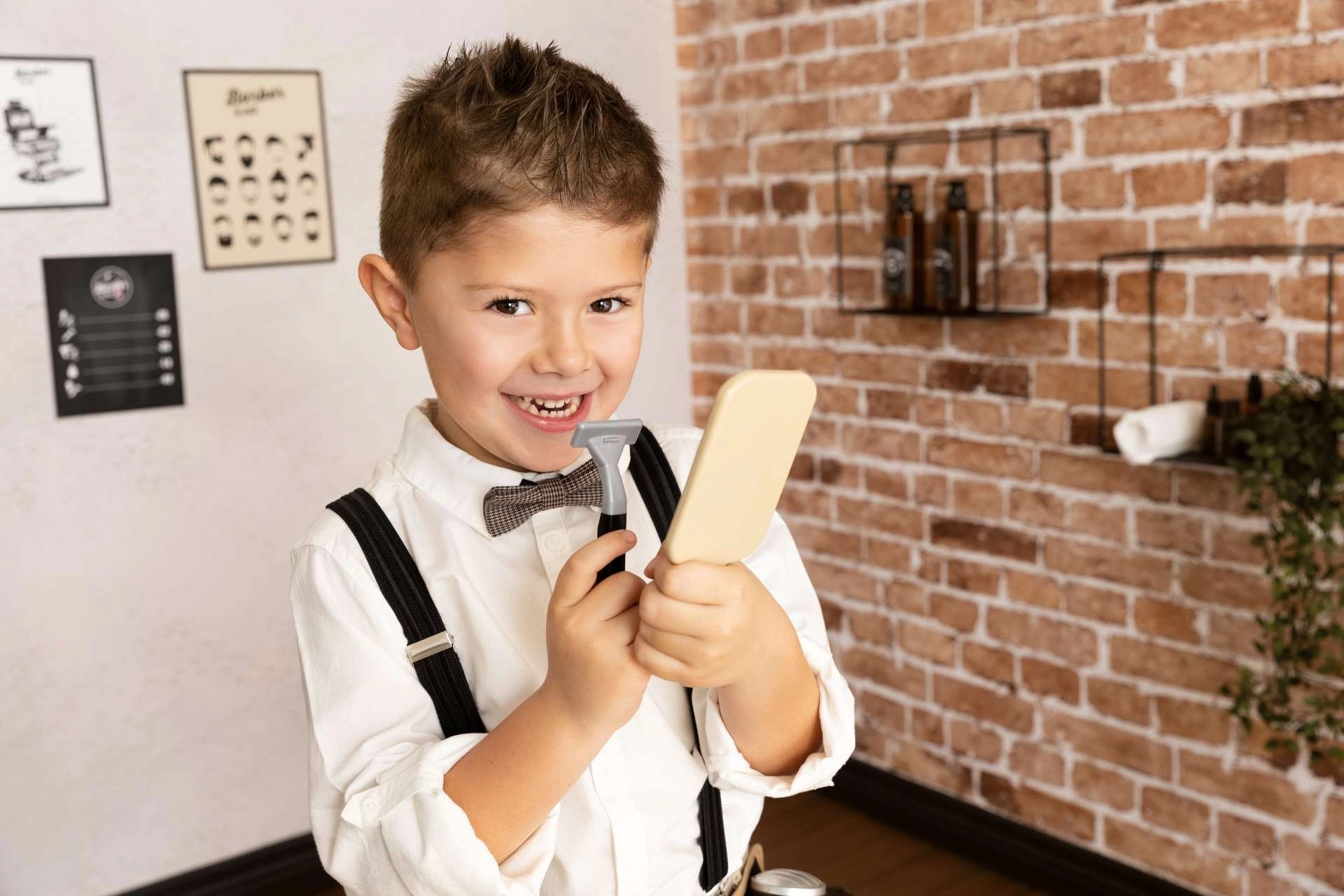 Καθρεφτάκι, ψαλίδι, χτένα, πινέλο, ξυριστική μηχανή και άλλα αξεσουάρ προσφέρουν ώρες ασφαλούς, δημιουργικής διασκέδασης για παιδιά από 3 ετών.