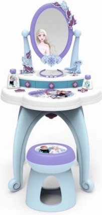 Τουαλέτα 2-σε-1 εμπνευσμένη από το Παγωμένο Βασίλειο προσφέρει όσα χρειάζονται οι μικρές πριγκίπισσες για την καθημερινή τους φροντίδα. Περιλαμβάνει μεγάλο περιστρεφόμενο καθρέφτη και πλούσια αξεσουάρ, όπως αρώματα και άλλα καλλυντικά αξεσουάρ.