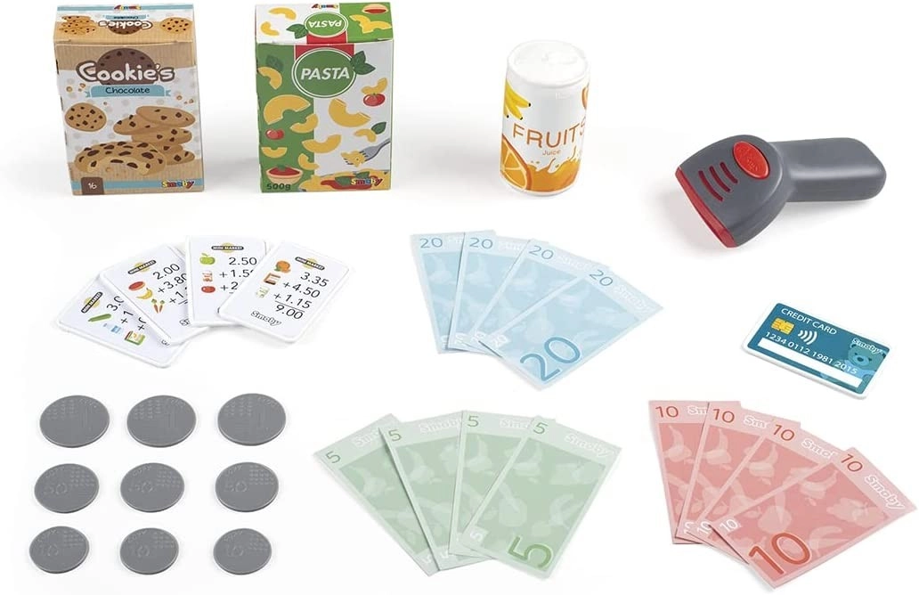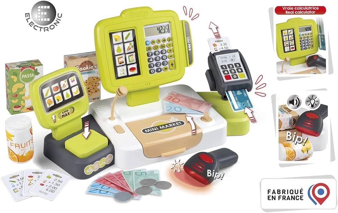 Η παιδική ηλεκτρονική ταμειακή μηχανή SMOBY προσφέρει ρεαλιστικό παιχνίδι καταστήματος με πλήθος αξεσουάρ. Τα παιδιά μπορούν να ζυγίζουν προϊόντα, να τα «σκανάρουν» με σαρωτή με φως και ήχο και να πληρώνουν με κέρματα, χαρτονομίσματα ή κάρτα. Περιλαμβάνει πραγματική αριθμομηχανή με LCD, ανοιγόμενο συρτάρι χρημάτων και 30 κομμάτια αξεσουάρ για ατελείωτη διασκέδαση και μάθηση.