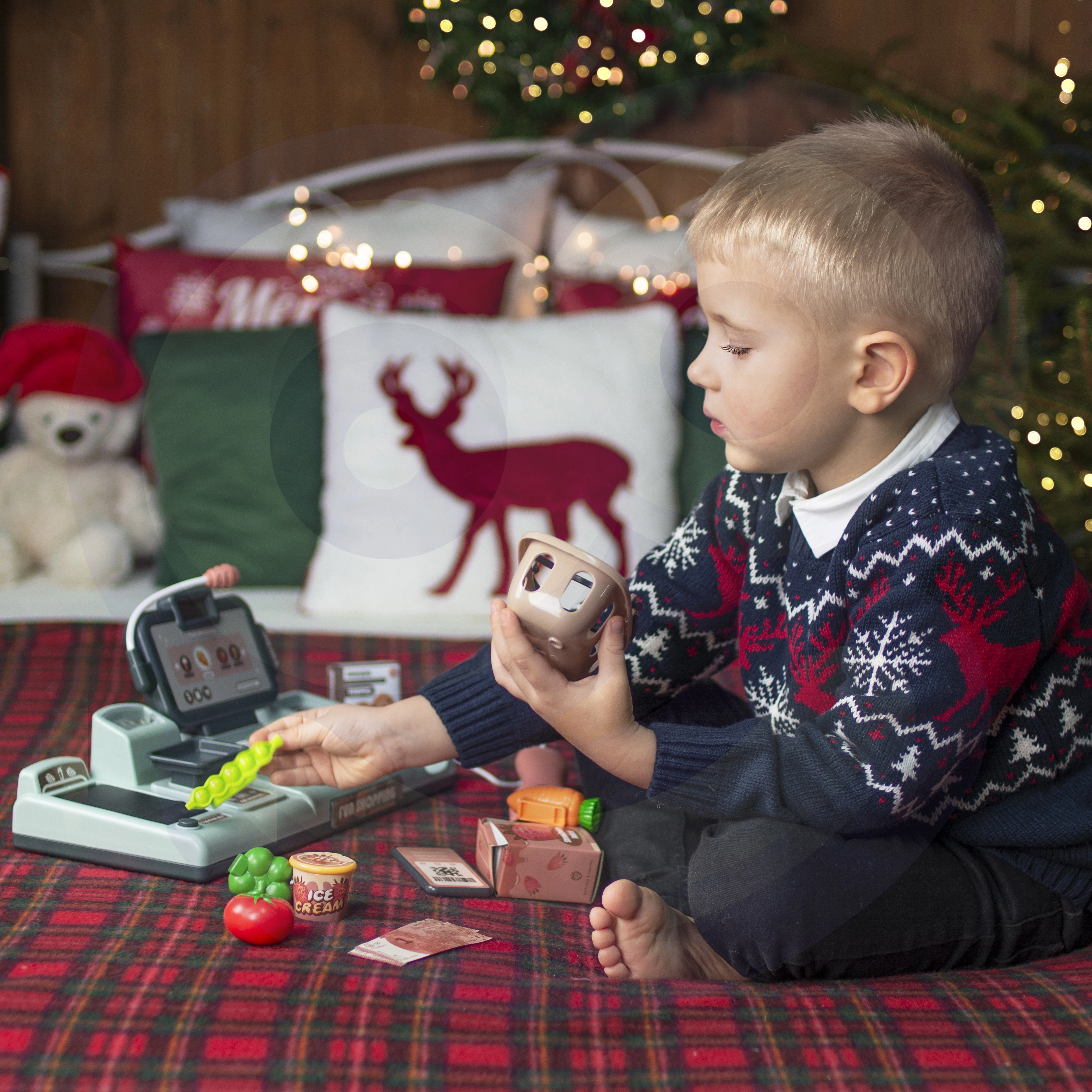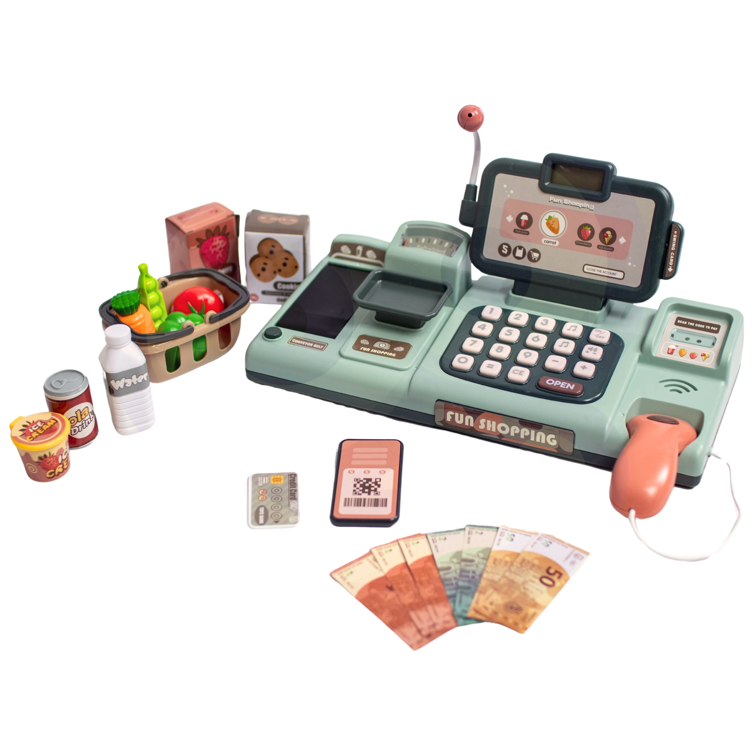 Το ταμείο περιλαμβάνει τερματικό, χάρη στο οποίο το παιδί μπορεί να πραγματοποιεί πληρωμές με μετρητά, κάρτα ή smartphone, όπως οι ενήλικες στο κατάστημα. Η ενσωματωμένη ζυγαριά και κινούμενος ιμάντας επιτρέπουν στο παιδί να οργανώνει τις αγορές και να βιώνει τον πραγματικό ρόλο του πωλητή.