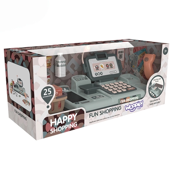Το παιδικό ταμείο Woopie είναι απαραίτητο για κάθε μικρό καταστηματάρχη. Είναι εξοπλισμένο με αριθμομηχανή με οθόνη LCD, όπου εμφανίζονται ψηφία, καθώς και με ηχητικό σαρωτή προϊόντων, που προσφέρει ρεαλιστική εμπειρία αγορών.