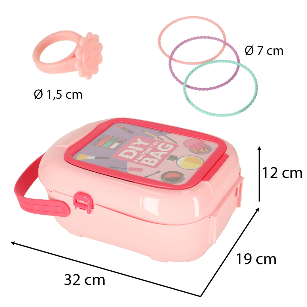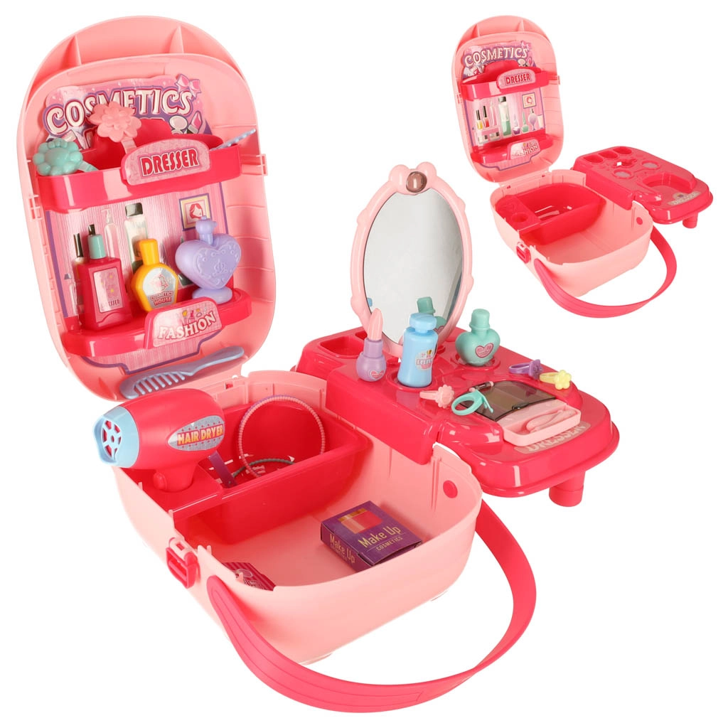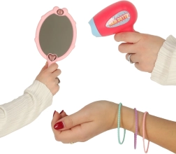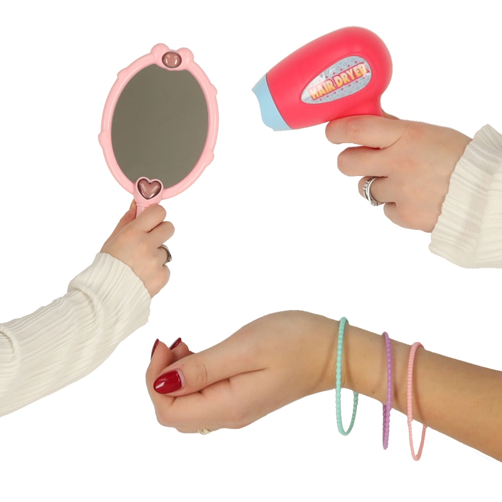 Κασετίνα, παιδικό σεσουάρ, καθρεφτάκι, χτένα, τσιμπιδάκια, δαχτυλίδια, βραχιολάκια, σετ αυτοκόλλητων, χρωματιστά μπουκαλάκια που μιμούνται βερνίκι και αρώματα