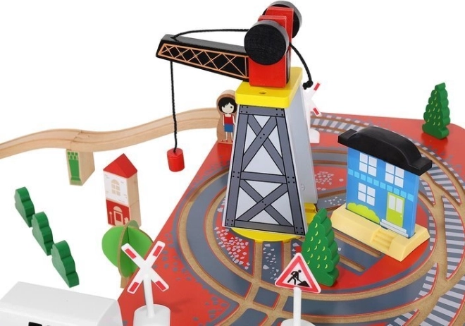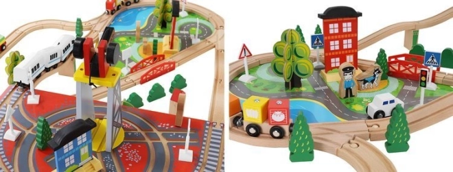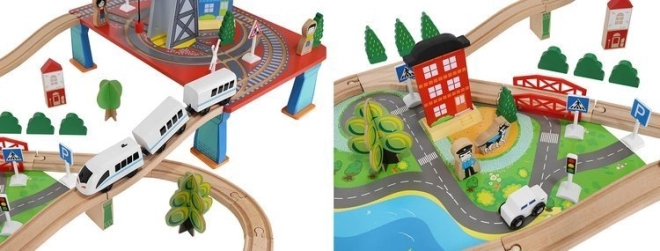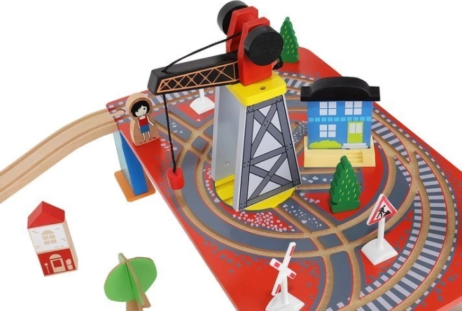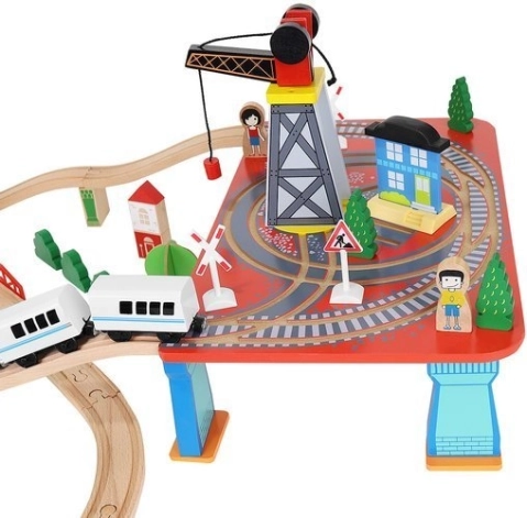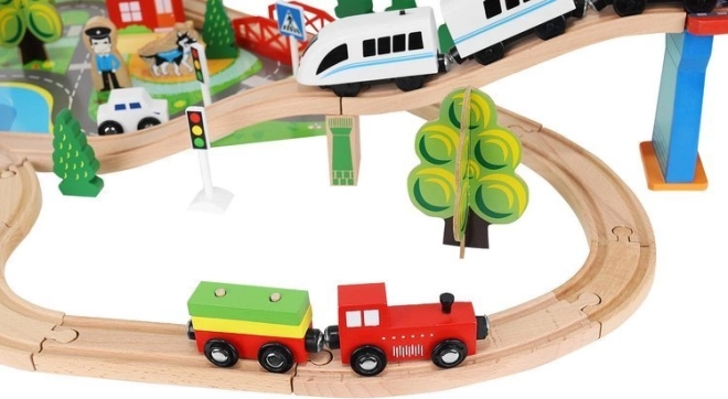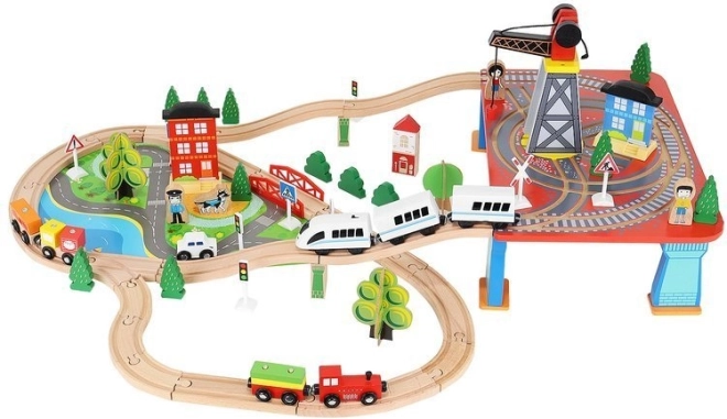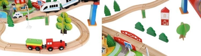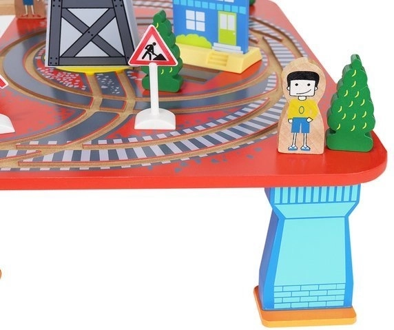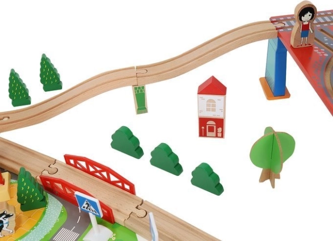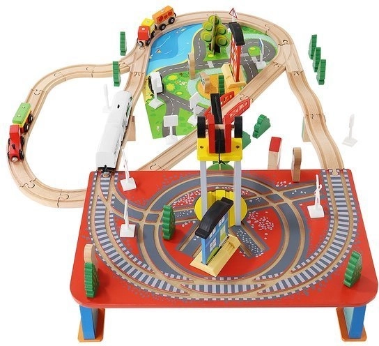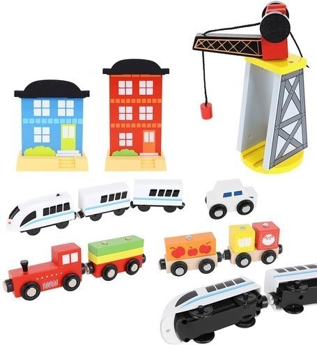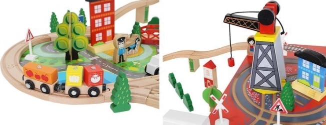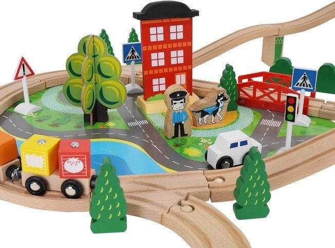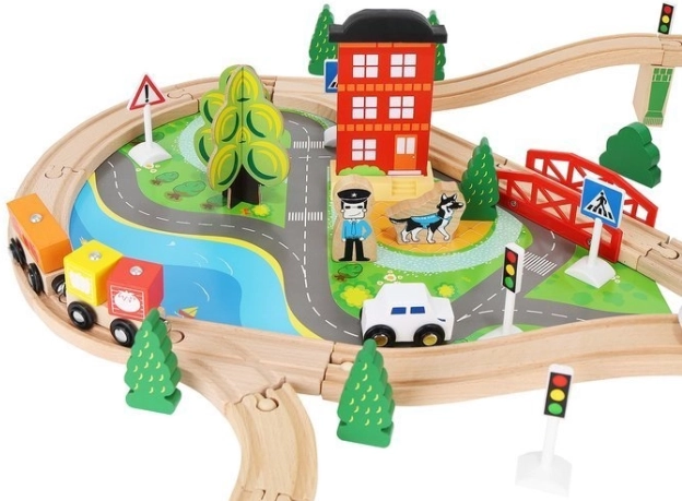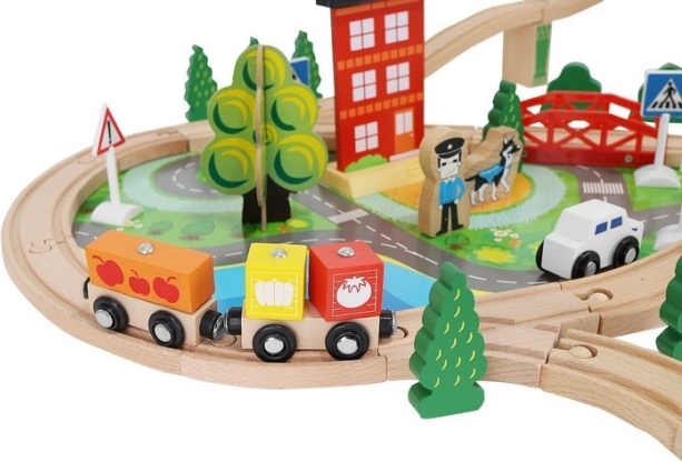 Ξύλινη σιδηροδρομική πίστα με συνολικά 88 προσεκτικά κατασκευασμένα στοιχεία, συμπεριλαμβανομένων σιδηροτροχιών, εμπορικού και επιβατικού τρένου, αυτοκινήτου, δενδρυλλίων και πινακίδων κυκλοφορίας. Η διασκέδαση έγκειται στη δυνατότητα δημιουργίας δικής σας διαδρομής, ενώ η μαγνητική σύνδεση των επιμέρους τμημάτων εξασφαλίζει εύκολο χειρισμό.