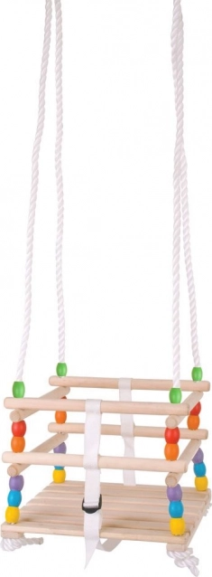Πρώτη παιδική κούνια από ποιοτικό ξύλο με σταθερή κατασκευή, πολύχρωμες χάντρες και ζώνη ασφαλείας. Το σκοινί είναι ρυθμιζόμενο έως 1,12 m, μέγιστο φορτίο 25 kg. Ιδανική για κήπο και βεράντα, πληροί τις ευρωπαϊκές προδιαγραφές ασφαλείας.