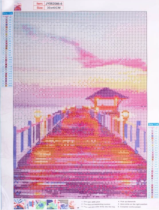 Το σετ περιλαμβάνει τυπωμένο καμβά με αυτοκόλλητη επιφάνεια, χρωματιστά πετραδάκια σε τριάντα αποχρώσεις και ποιοτικά εργαλεία εφαρμογής. Χάρη στο απλό σύστημα σήμανσης κατά γράμματα – κάθε τμήμα του καμβά αντιστοιχεί σε συγκεκριμένο χρώμα πετραδιών – η δημιουργία της μωσαϊκής εικόνας είναι διαισθητική και απροβλημάτιστη.