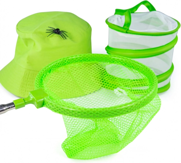 Απόχη, δοχείο για τα ευρήματα, μεγεθυντικός φακός, τσιμπιδάκια συλλογής, κιάλια και καπελάκι – πλήρης εξοπλισμός για ασφαλές πιάσιμο και παρατήρηση εντόμων και της φύσης γενικότερα.