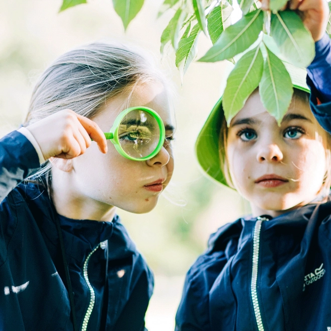 Ο μεγεθυντικός φακός και το διαφανές δοχείο με καπάκι επιτρέπουν στα παιδιά να εξερευνούν λεπτομέρειες από πολύ κοντά, με σεβασμό προς τη φύση.