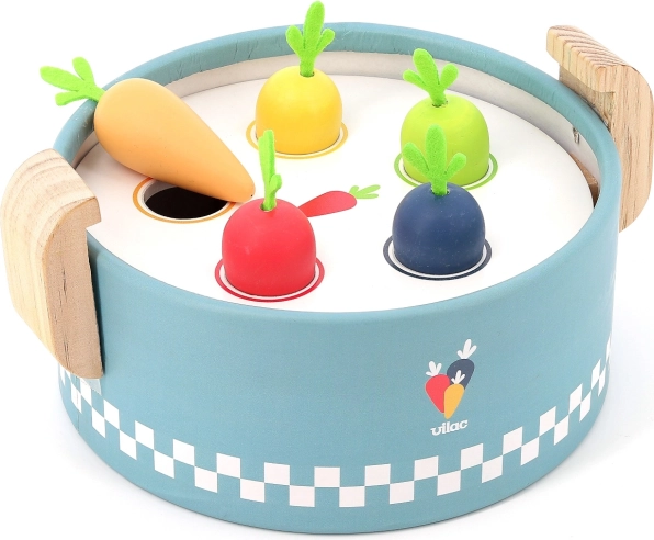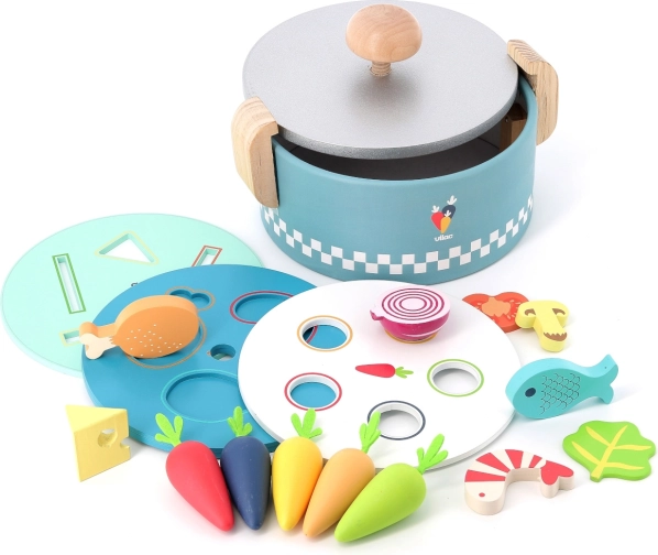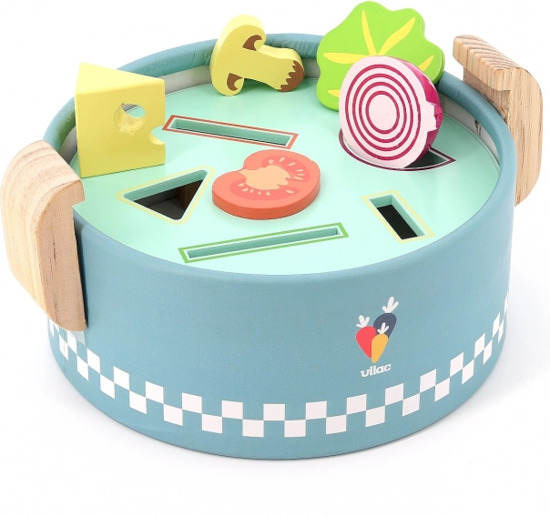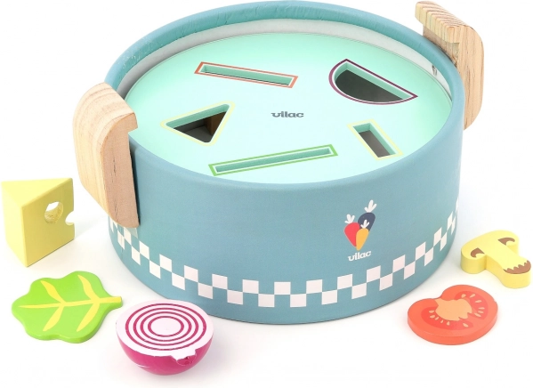 Η μίνι κατσαρόλα ταξινόμησης VILAC είναι ένα έξυπνο ξύλινο παιχνίδι για τους μικρούς από 18 μηνών. Κάτω από το καπάκι κρύβονται τρεις εναλλάξιμες πλάκες με διαφορετικά σχήματα, στα οποία τα παιδιά τοποθετούν ή ρίχνουν πολύχρωμα κομμάτια τροφίμων. Έτσι δημιουργείται ένα «μαγείρεμα» σαν αληθινό, που καλλιεργεί τη φαντασία και τις πρακτικές δεξιότητες.