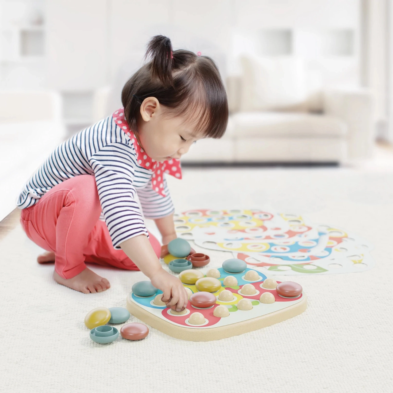 Κάθε κομμάτι του μωσαϊκού βοηθά στην ανάπτυξη του συντονισμού χεριού-ματιού και των δεξιοτήτων λεπτής κινητικότητας χάρη στις πολύχρωμες καρφίτσες.