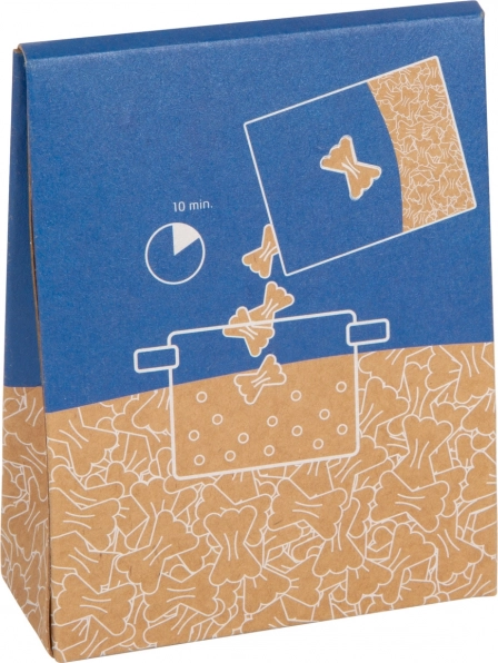 Το χάρτινο κουτί ανοίγει και κλείνει εύκολα και στο πίσω μέρος προσφέρει έναν κατανοητό εικονογραφημένο «οδηγό μαγειρέματος».