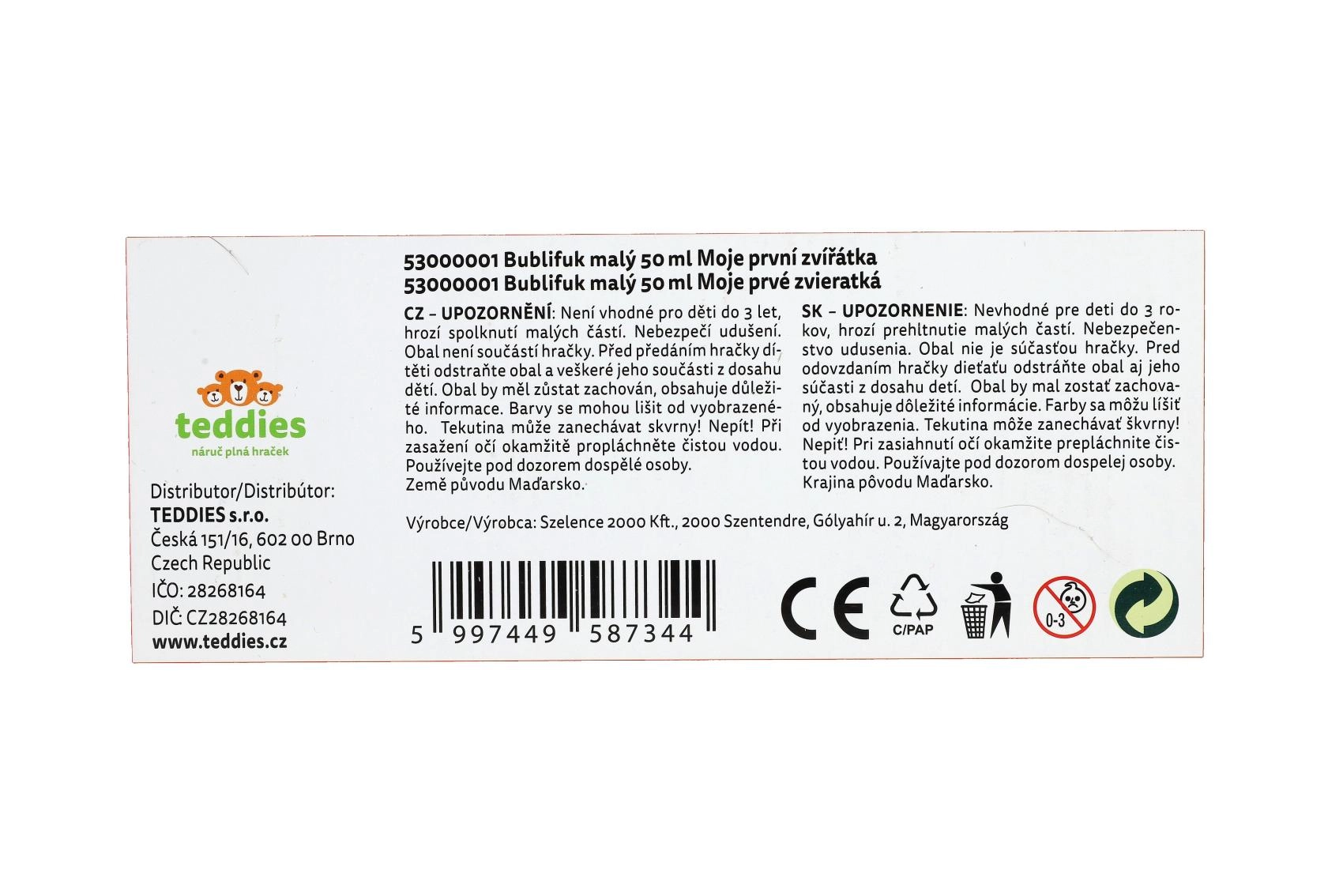 Διασκεδαστικές σαπουνόφουσκες με θέμα Τα Πρώτα Μου Ζωάκια που θα χαρίσουν χαρά σε κάθε παιδί. Περιέχει 50 ml υγρό για φούσκες, στο καπάκι υπάρχει ενσωματωμένο παιχνίδι και το φυσάκι είναι μέρος του καπακιού. Ιδανικό για πάρτι, παιχνίδι σε εξωτερικούς χώρους και μικρές ανταμοιβές. Κατάλληλο από 6 ετών.
