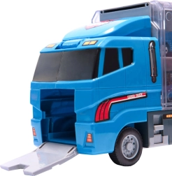 Το μπλε φορτηγό όχι μόνο μεταφέρει έως και 14 οχήματα, αλλά οι ρεαλιστικές λεπτομέρειές του το κάνουν ακαταμάχητο παιχνίδι για τα παιδιά. Οι διάφανες πόρτες και ο εκτοξευτής προσθέτουν επιπλέον ενθουσιασμό.