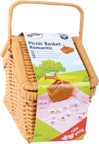 Ρομαντικό καλάθι πικνίκ με εξοπλισμό για τέσσερις «καλεσμένους» προσφέρει στα παιδιά ρεαλιστική εμπειρία υπαίθριου σερβιρίσματος. Στο καλάθι θα βρείτε πιατάκια, φλιτζάνια με πιατάκια, μαχαιροπίρουνα, καθώς και τσαγιέρα/καφετιέρα, ζαχαριέρα και κανατάκι γάλακτος. Χάρη στην στιβαρή κατασκευή από συνθετική ψάθα και την πρακτική οργάνωση, όλα είναι ασφαλώς τακτοποιημένα και έτοιμα για εκδρομές στο πάρκο ή στον κήπο.