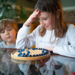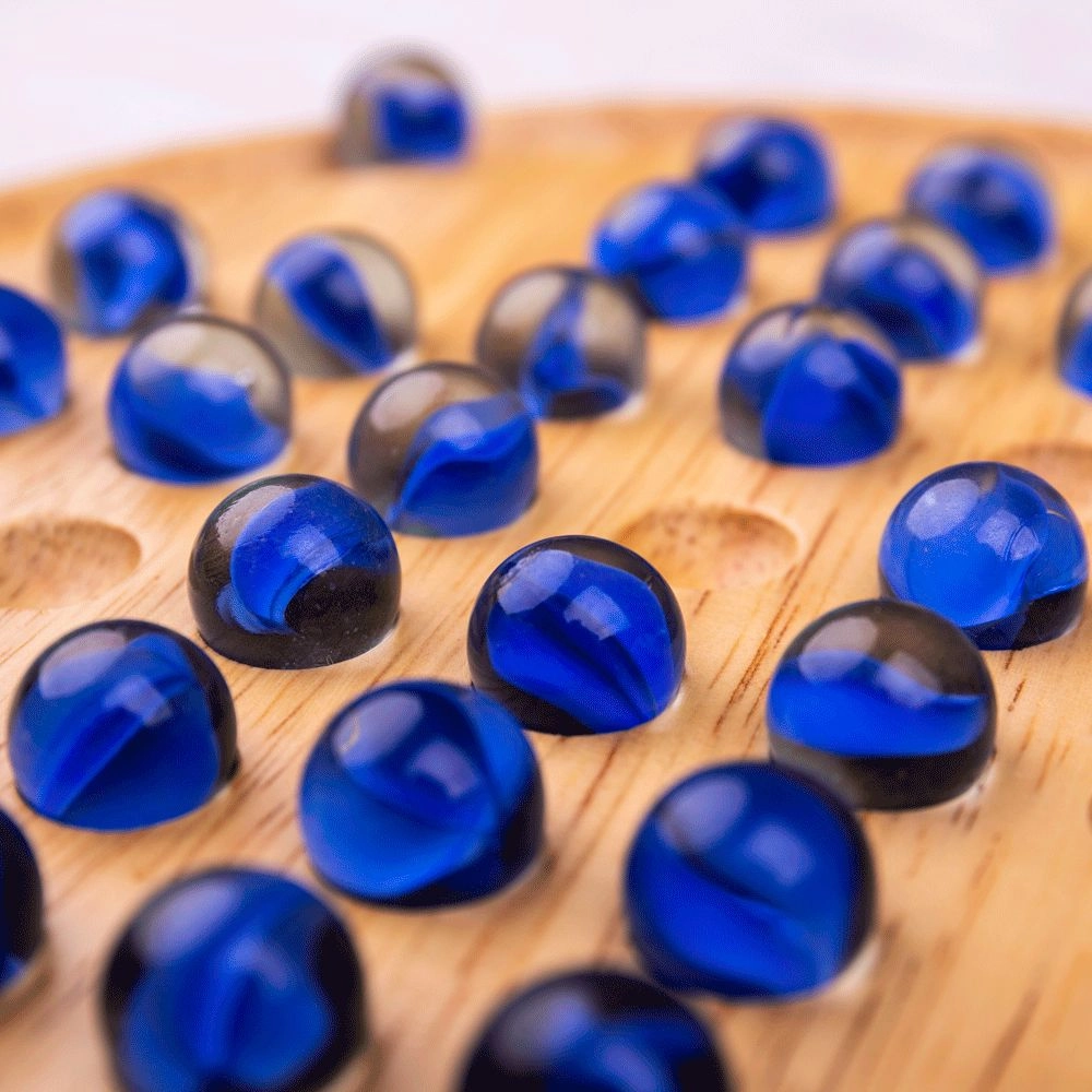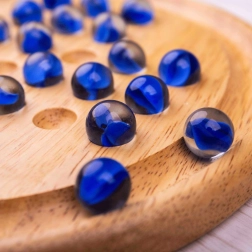 Η κυκλική ξύλινη βάση και οι γυαλιστερές γυάλινες μπίλιες προσφέρουν ευχάριστη αίσθηση στο παιχνίδι και μεγάλη αντοχή.