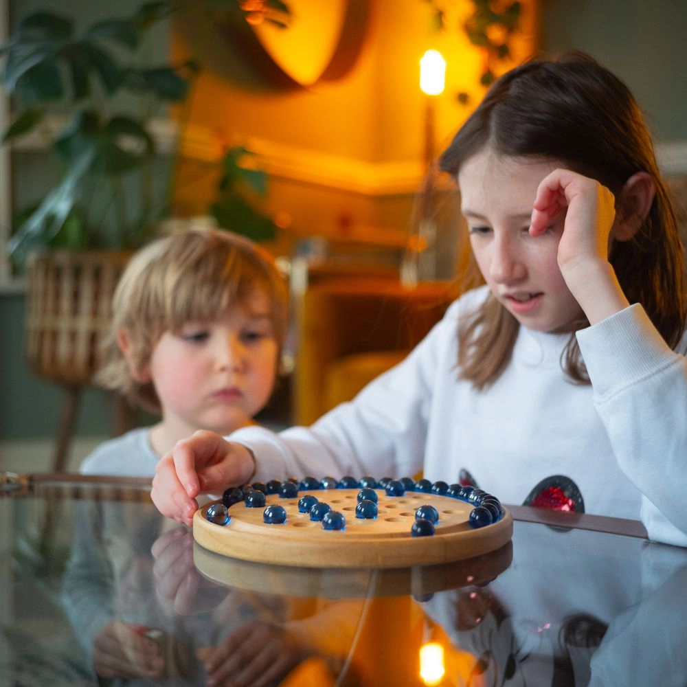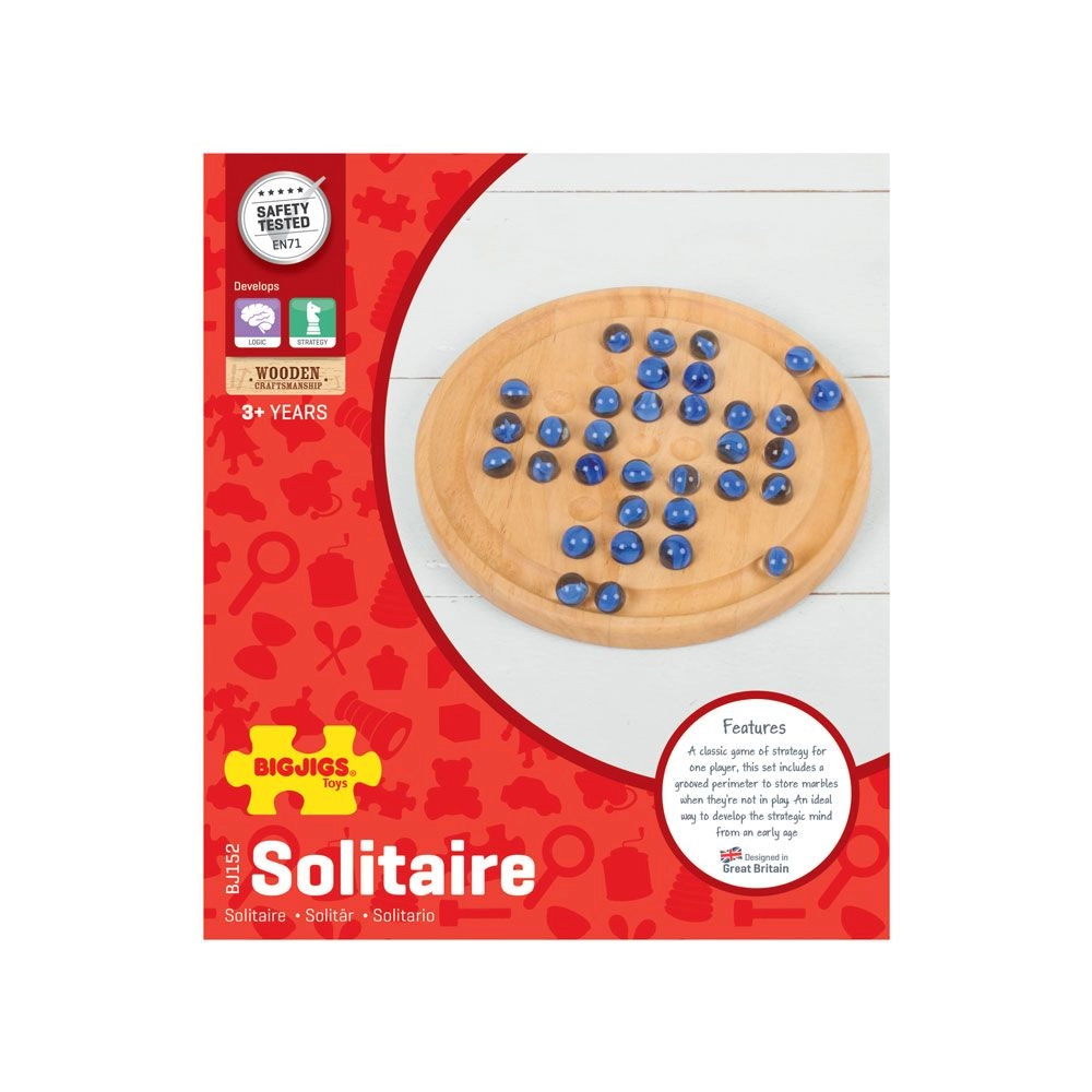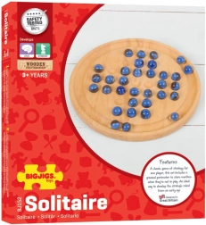 Ανακαλύψτε τη διαχρονική διασκέδαση με το ξύλινο σολιτέρ BIGJIGS TOYS. Οι γυαλιστερές μπλε μπίλιες και η προσεκτικά δουλεμένη κυκλική βάση δημιουργούν ένα κομψό λογικό παιχνίδι που δοκιμάζει την ευστροφία και την υπομονή σας. Στόχος είναι, πηδώντας μπίλια πάνω από μπίλια, να μείνει στο ταμπλό μόνο μία.