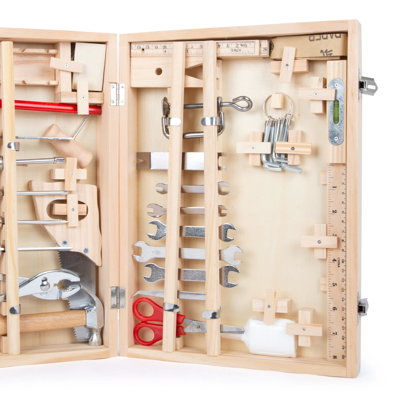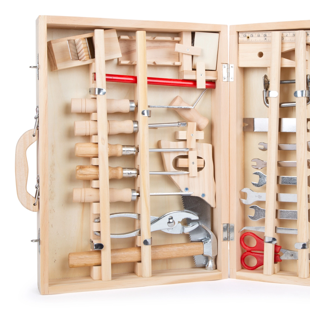 Στη βαλίτσα θα βρείτε ό,τι χρειάζεται για μικρά οικιακά έργα και παιχνίδια ρόλων ως τεχνίτες: κλειδιά, κατσαβίδια, πριόνι, ψαλίδι, σμίλη, μαραγκομολύβι, εξάγωνο κλειδί, σφυρί και άλλα αξεσουάρ. Το σετ 48 τεμαχίων ενισχύει τη λεπτή κινητικότητα, τη συγκέντρωση και τη δημιουργικότητα.